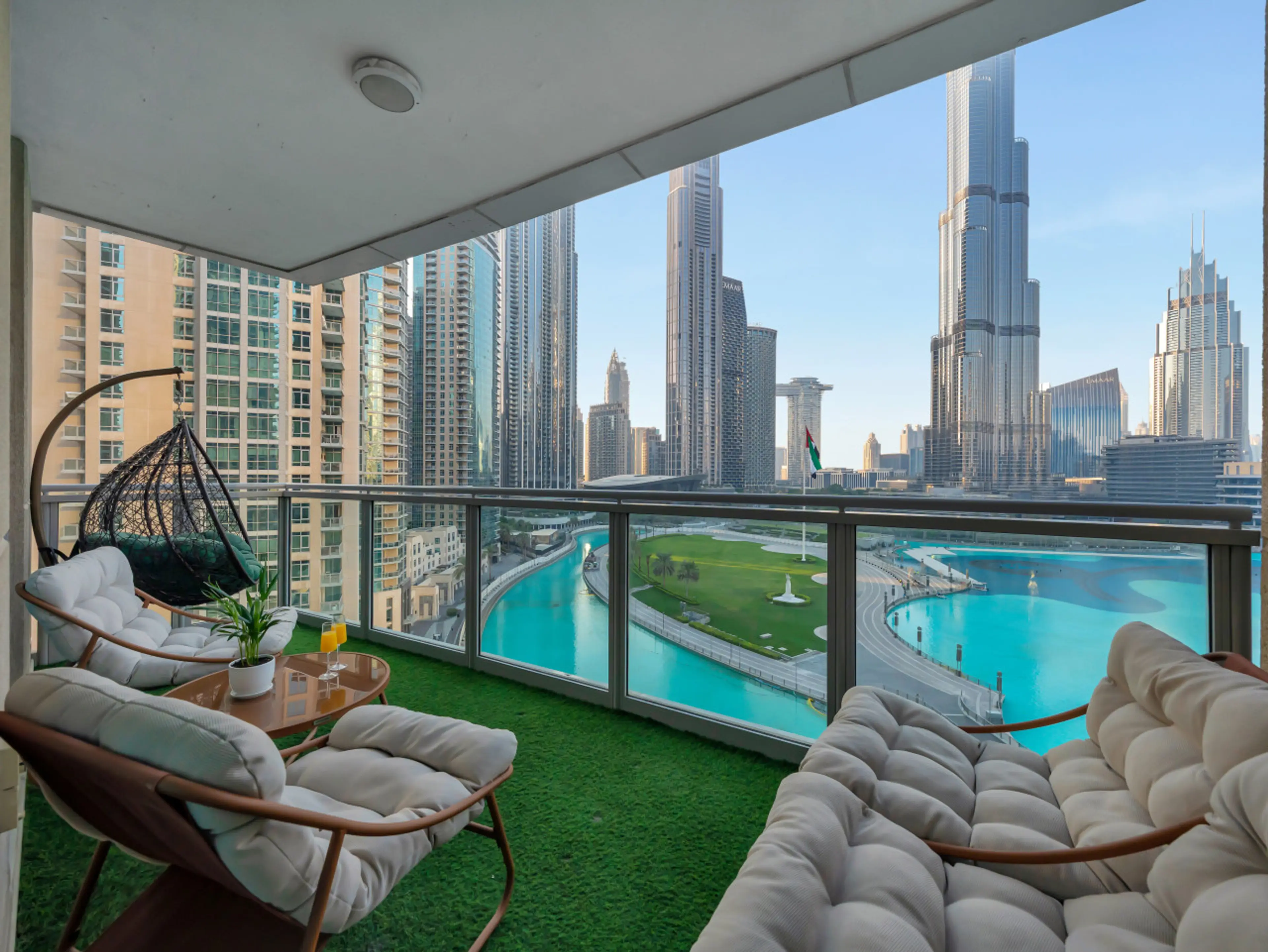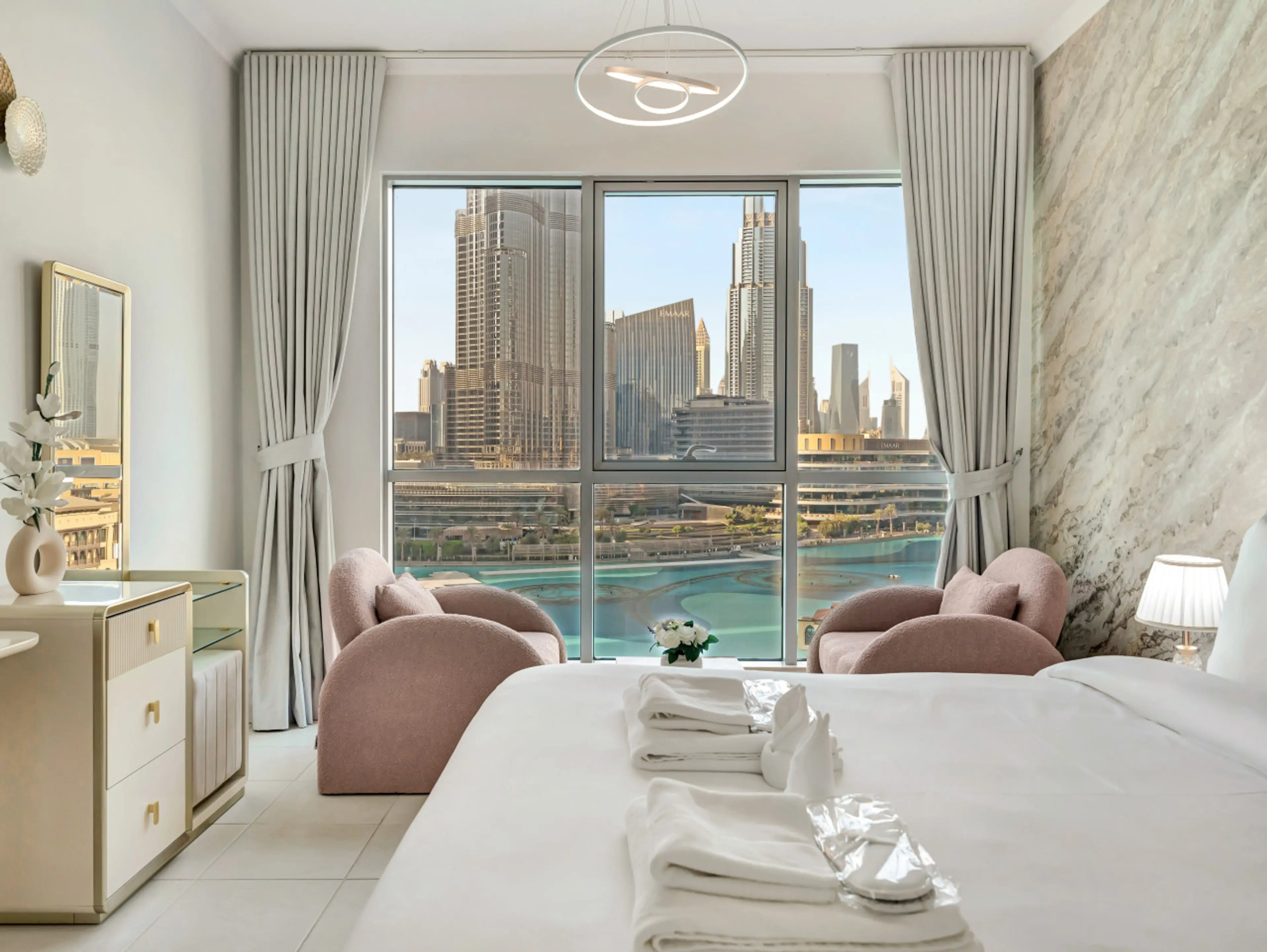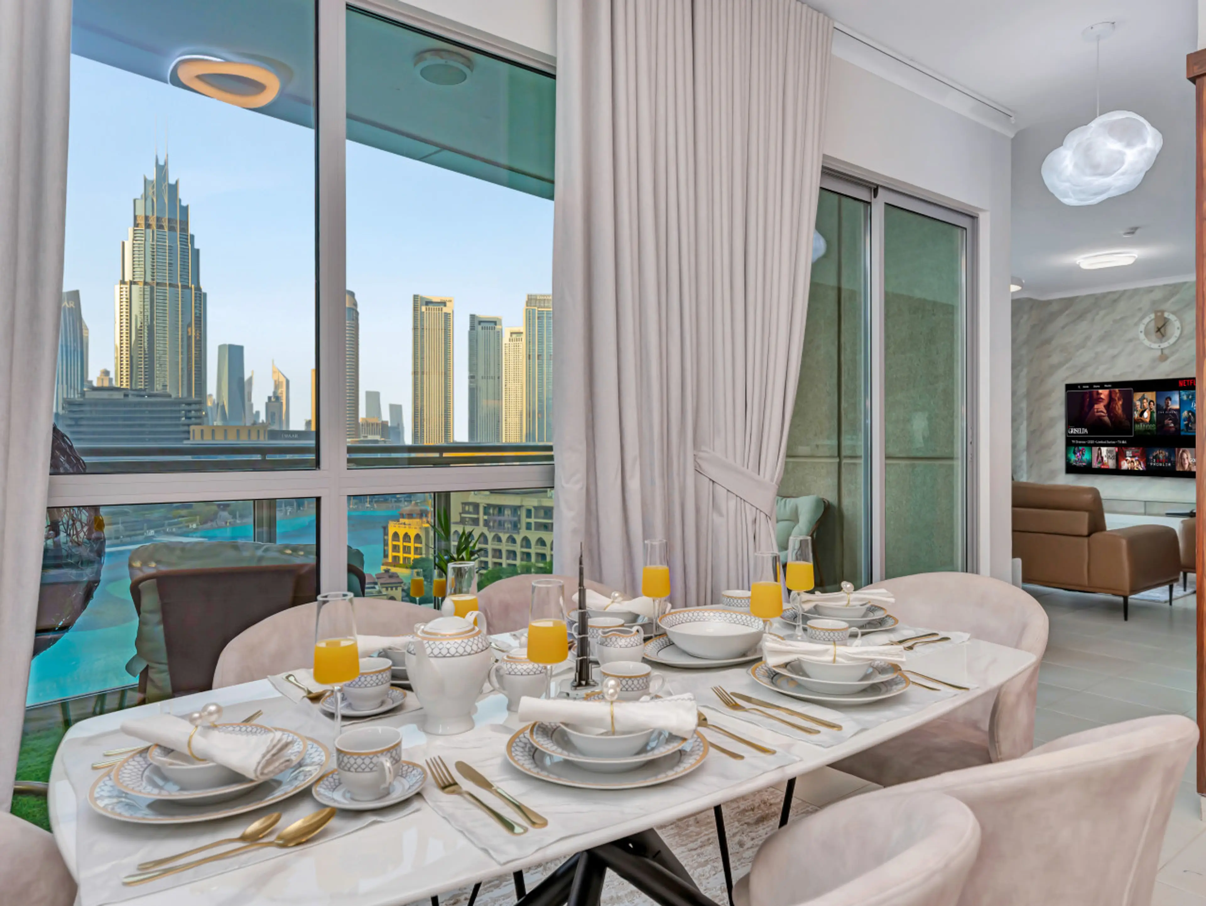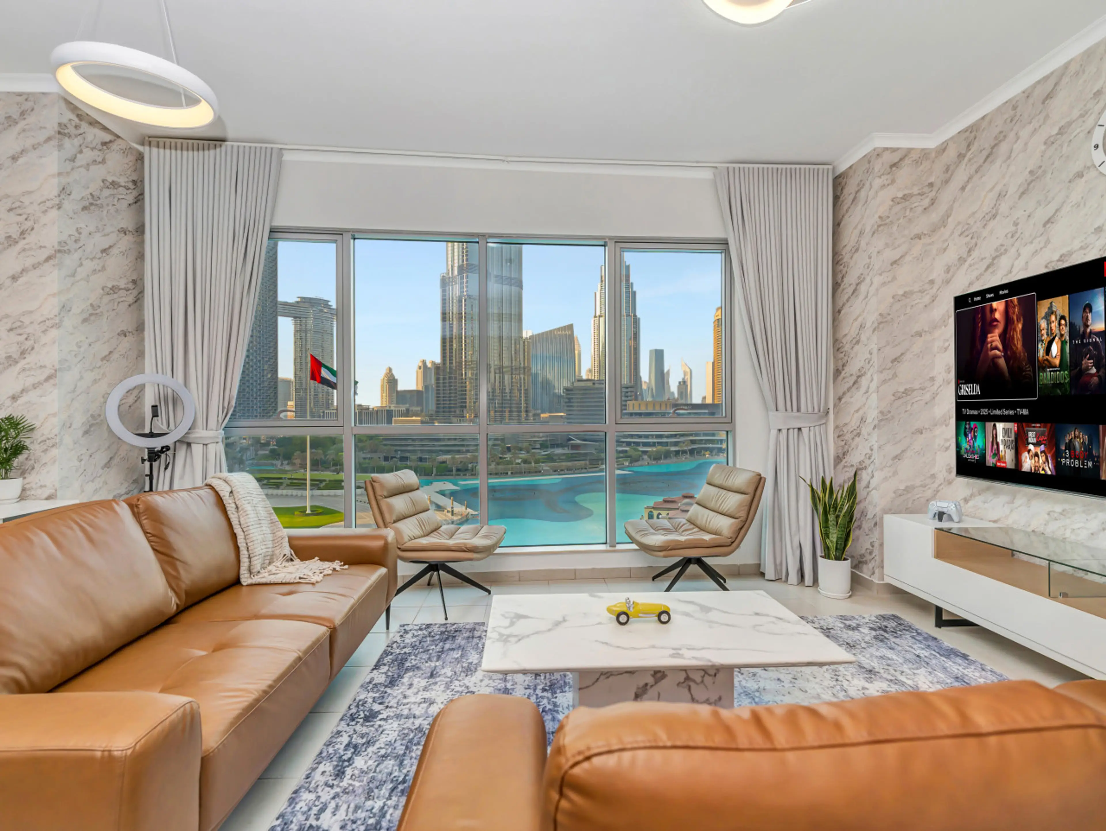 Front-row views of Burj Khalifa & Fountain with 5★ comfort Experience deluxe living in Downtown Dubai with front-row views of Burj Khalifa, LED shows & the Dubai Fountain from your living, dining, master suite & balcony. This spacious apartment hosts 6 adults + 4 children, featuring 3 elegant bedro...